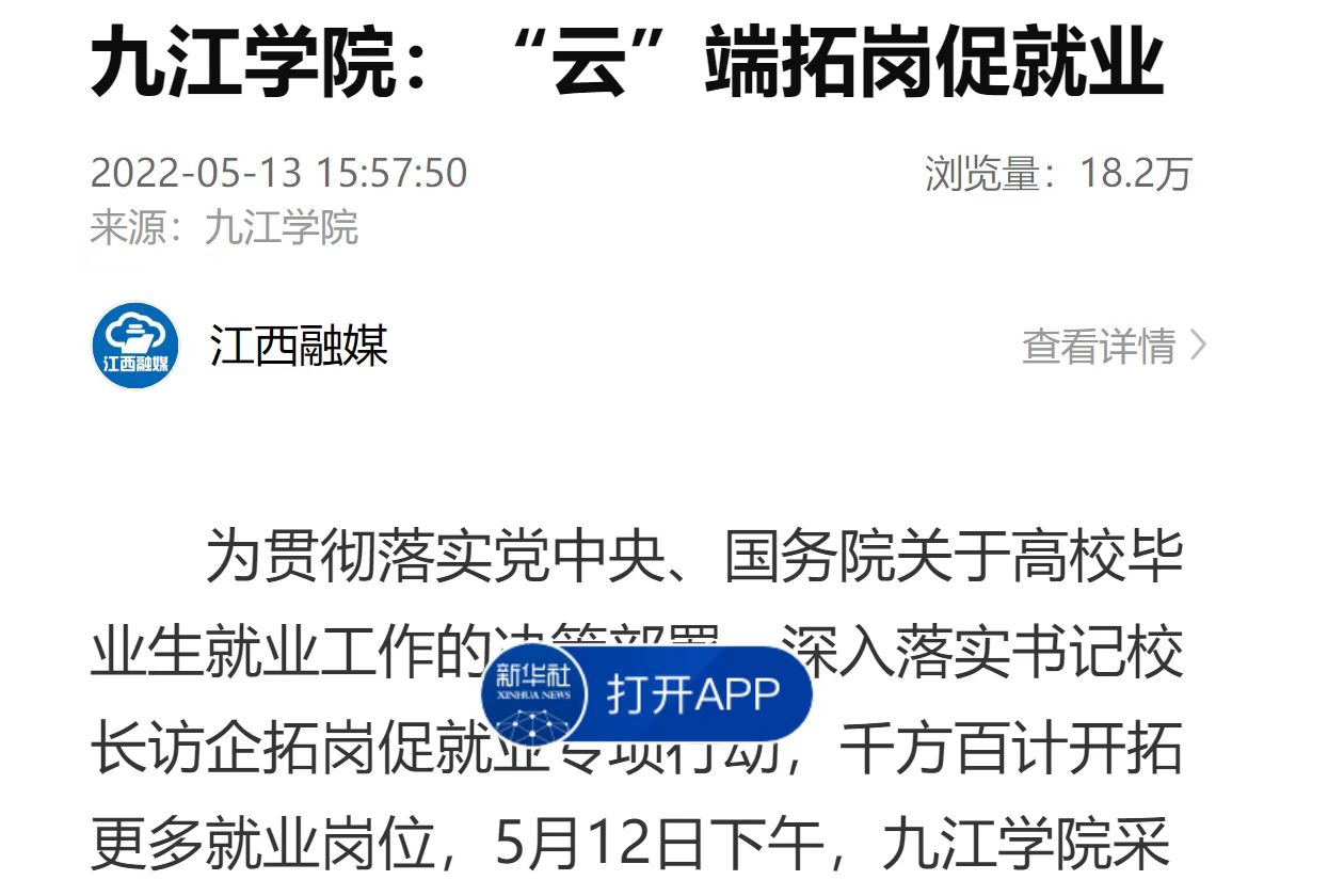 5月12日,永利yl23411集团官网采用云端会议的方式举办九江学院书记、校长访企拓岗促就业专项行动云端推介会。连续几日,人民日报以《九江学院:书记校长齐行动,云端拓岗促就业》为题,客户端平台上浏览量达2.9万次;中国教育发布、新华网、江西教育电视台以《九江学院云端促就业》为题,报道永利yl23411集团官网深入落实书记校长访企拓岗促就业专项行动,千方百计为大学毕业生开拓更多就业岗位,不断提升服务地方经济社会高质量发展能力。
