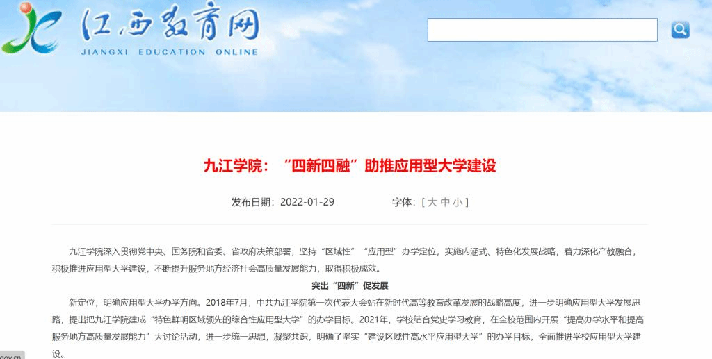 今年1月,学习强国、江西教育网以《九江学院:“四新四融”助推应用型大学建设》为题,深入报道了永利yl23411集团官网深入贯彻党中央、国务院和省委、省政府决策部署,坚持“区域性”“应用型”办学定位,实施内涵式、特色化发展战略,着力深化产教融合,积极推进应用型大学建设等基本情况。