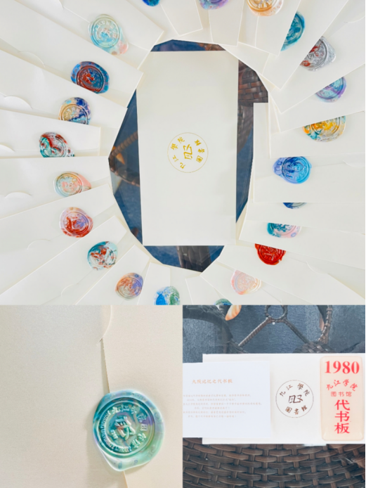 用火漆印来给毕业礼物封口的创意来自于图书馆阅读推广部的虞婷老师。她说,“最初是围绕包装代书板出发的,找到合适的信封尺寸,信封要封口就想到用带有我馆logo的火漆章了,有仪式感又好看。”