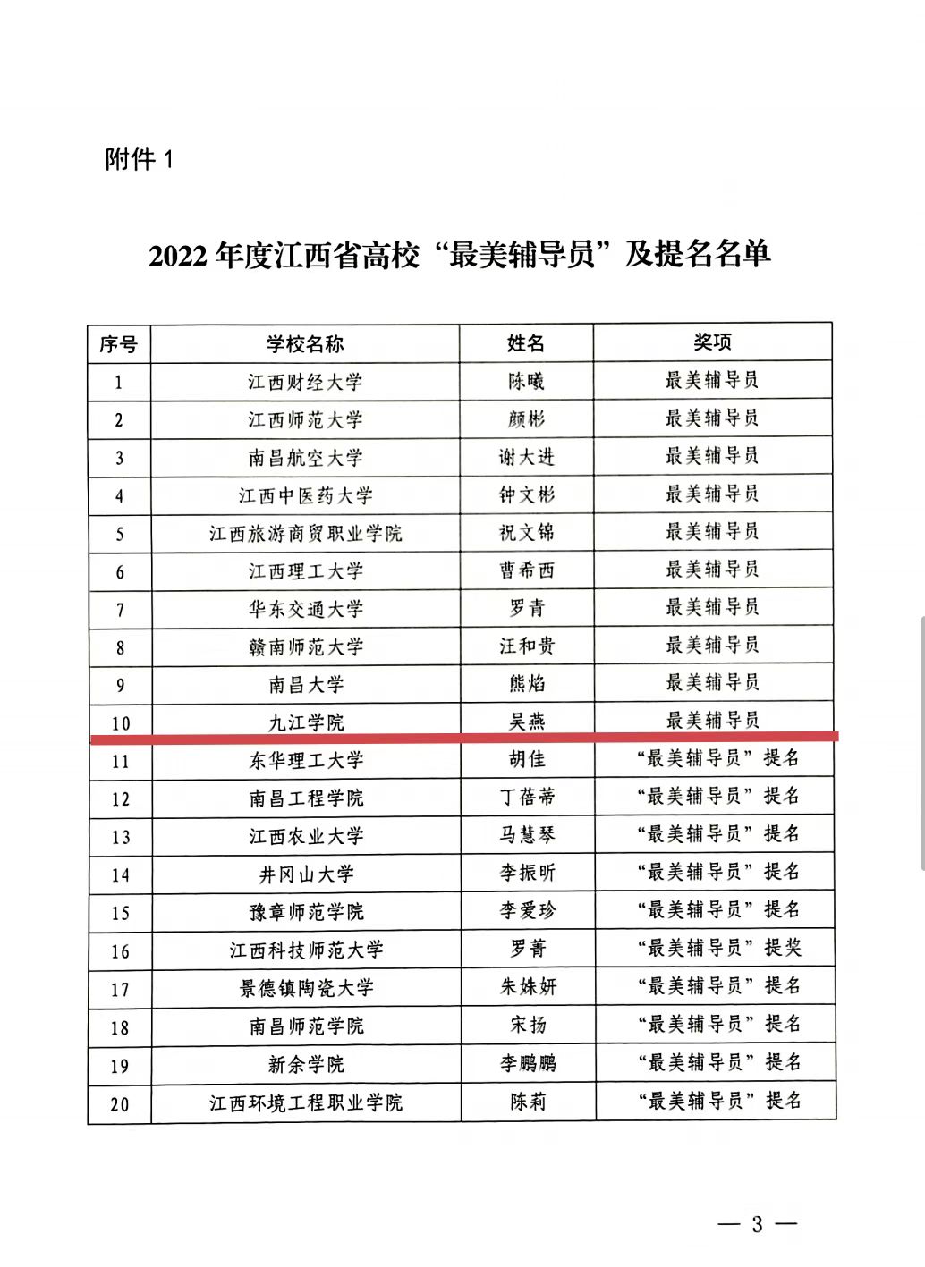 近日,中共江西省委宣传部、中共江西省委教育工委、江西省教育厅联合下发了《关于公布 2022 年度全省高校“最美辅导员”“最美大学生”推选活动结果的通知 》,永利yl23411集团官网教育学院吴燕老师荣获2022年度高校“最美辅导员”称号,管理学院18级本科生吴胜林同学荣获2022年度 “最美大学生”提名奖。
