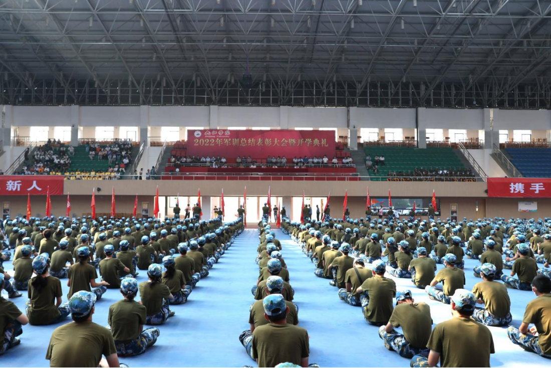 9月30日上午,永利yl23411集团官网在主校区体育训练中心召开2022年新生军训总结表彰大会暨开学典礼。校党委书记赵伟出席大会,并代表学校向武警九江支队赠送锦旗。校长陈小林致辞,勉励2022级新同学在最美的时光奋斗出最闪亮的青春,成就最美好的自己。