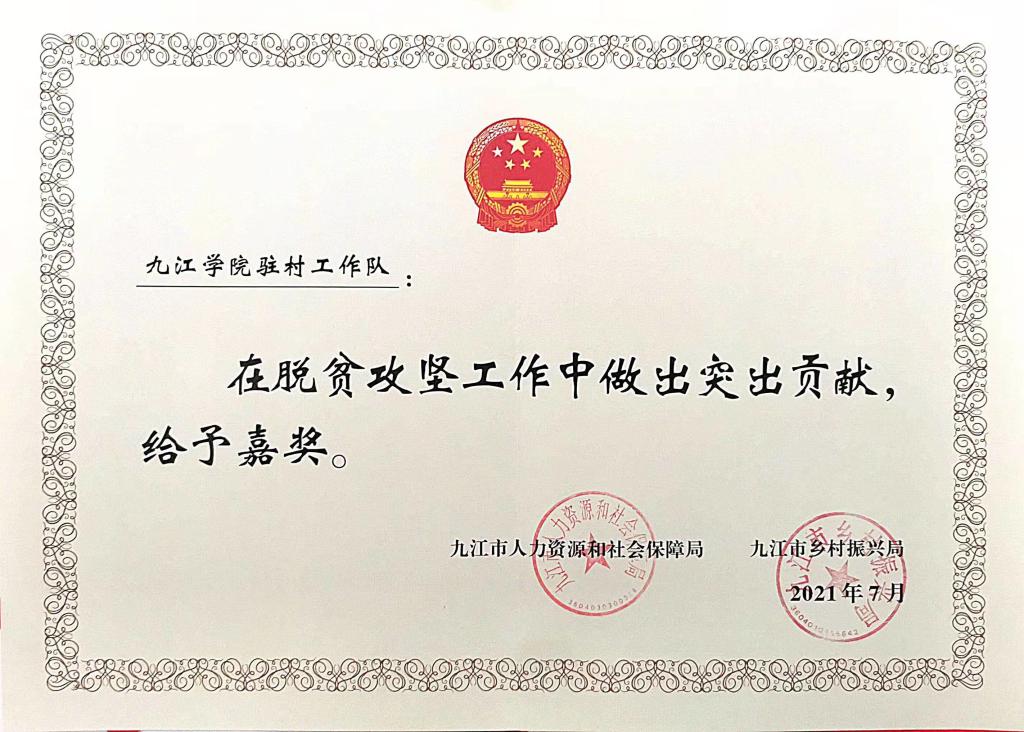 一是学校先后荣获省市先进集体。九江学院帮扶武宁县在省派单位考核中连续两次考评等次为“优”、荣获江西省省派单位帮扶先进集体、九江市事业单位脱贫攻坚嘉奖单位。