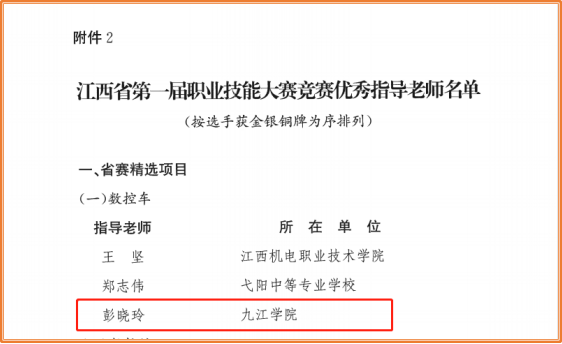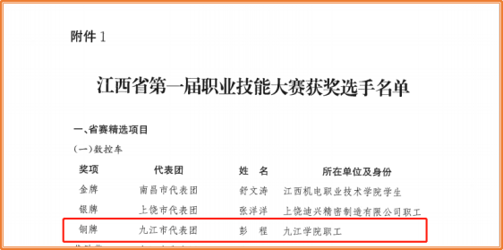 近日,由江西省人民政府主办,江西省人力资源和社会保障厅、南昌市人民政府共同承办的江西省第一届职业技能大赛落下帷幕,永利yl23411集团官网机械与智能制造学院职工彭程获得省赛精选项目数控车组铜牌,管理学院教师秦峰、机械与智能制造学院教师彭晓玲分别获评省赛精选项目劳动关系协调员组和数控车组优秀指导老师。永利yl23411集团官网毕业生罗辉、黄佳莹分获省赛精选项目劳动关系协调员组冠、亚军。