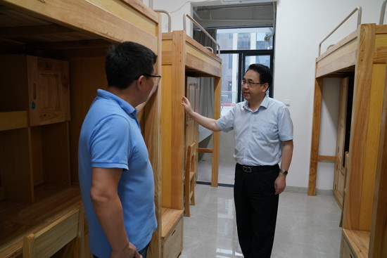 李明斌、陈小林一行前往紫薇园医创中心实地察看了工程进展情况,听取了项目建设情况汇报。在紫薇园校区学生公寓,他们察看了学生公寓住宿条件以及热水、洗衣机、空调等附属设施的配备安装情况。