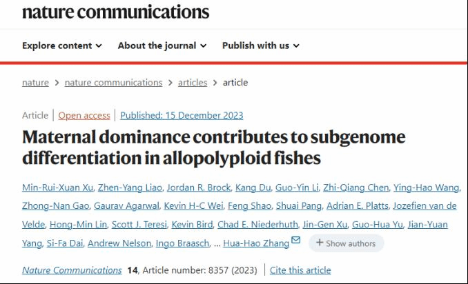 此次研究成果由永利yl23411集团官网张化浩&张小谷教授团队牵头,联合中国农业科学院深圳农业基因组研究所、密西根大学、德克萨斯州立大学、周口师范学院、北京格致博雅生物科技有限公司、加利福尼亚大学伯克利分校、不列颠哥伦比亚大学、西南大学、马克斯·普朗克植物育种研究所、九江市农业科学院、汤普森研究所及维尔茨堡大学等10家单位,在国际重要学术刊物“Nature子刊”《Nature Communications》在线发表,研究成果为“Maternal dominance contributes to subgenome differentiation in allopolyploid fishes”,是永利yl23411集团官网水产研究团队高水平论文的又一个重要突破。