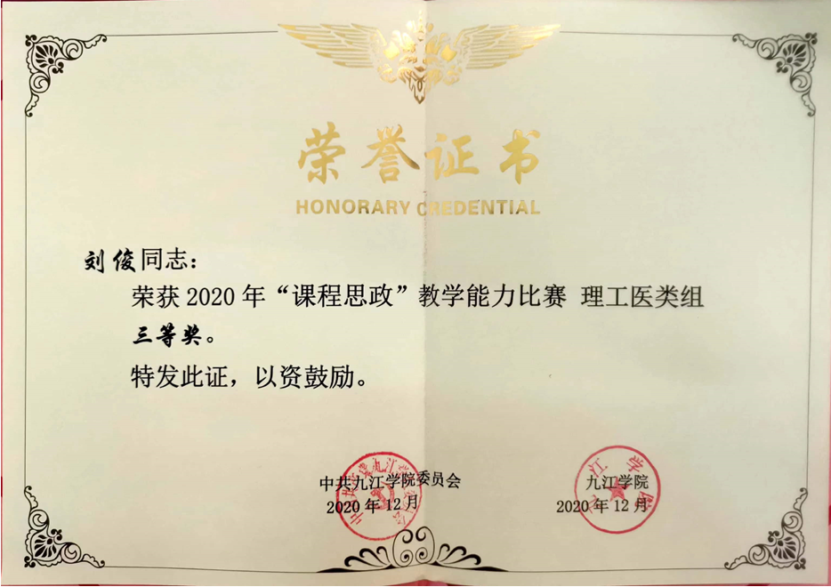 “教”得下来,刘俊又想“师”之有“道”。因为授课对象是一群比较特殊的群体——医学生,他们毕业后或将成为救死扶伤的医生,因此她的课堂更加注重医德医风教育。刘俊不断向前辈请教教学手段与教学方法,积极参加全国医学院校一流课程建设及申报认定全流程工作坊、全国医学院校课程思政教学设计与实施培训班等充实自己,课堂上则将思政元素润物细无声地融入专业之中,在培养学生严谨的逻辑分析能力的同时,教育引导学生始终把人民群众生命安全和身体健康放在首位,做党和人民信赖的好医生。2020年,她参加九江学院首届“课程思政”教学能力比赛并获得三等奖。2022年,被评为九江学院优秀教师、民盟九江市优秀盟员教师。近3年,她还先后参与了3项省级和校级教改课题《后疫情时代基于OBE理念的〈预防医学〉实验教学改革与实践》《〈预防医学〉课程浸入式“思政教育”的研究与实践》和《医药数理统计课程线上+线下混合式教学模式改革与实践》。