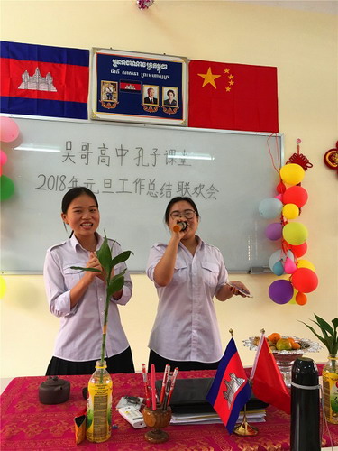 2017年12月28日,柬埔寨王家研究院孔子学院吴哥高中孔子课堂举办了2018年元旦工作总结和联欢会,孔子课堂负责人刘振和全体志愿者教师参加了此次活动。