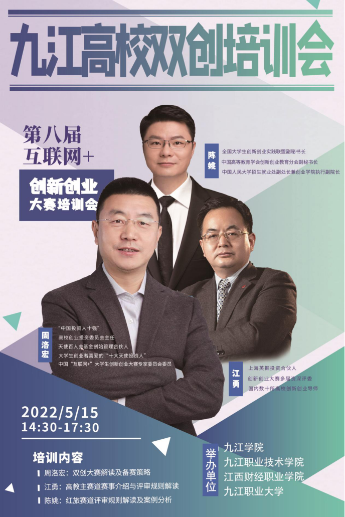 5月15日下午,九江高校第八届“互联网+”大学生创新创业大赛培训会在永利yl23411集团官网举行。会议特邀“中国投资人十强”、高校创业投资委员会主任、中国“互联网+”大赛评审委员会委员周洛宏,上海英掘投资合伙人、双创大赛资深专家江勇,中国人民大学创业学院执行院长、中国高等教育学会创新创业教育分会副秘书长陈姚到会指导。永利yl23411集团官网副校长陈春生、市就业创业服务中心副主任陈瑞生出席视频会议并致辞。永利yl23411集团官网、九江职业技术学院、江西财经职业学院、九江职业大学创新创业学院负责人及师生300多人参加视频会议。