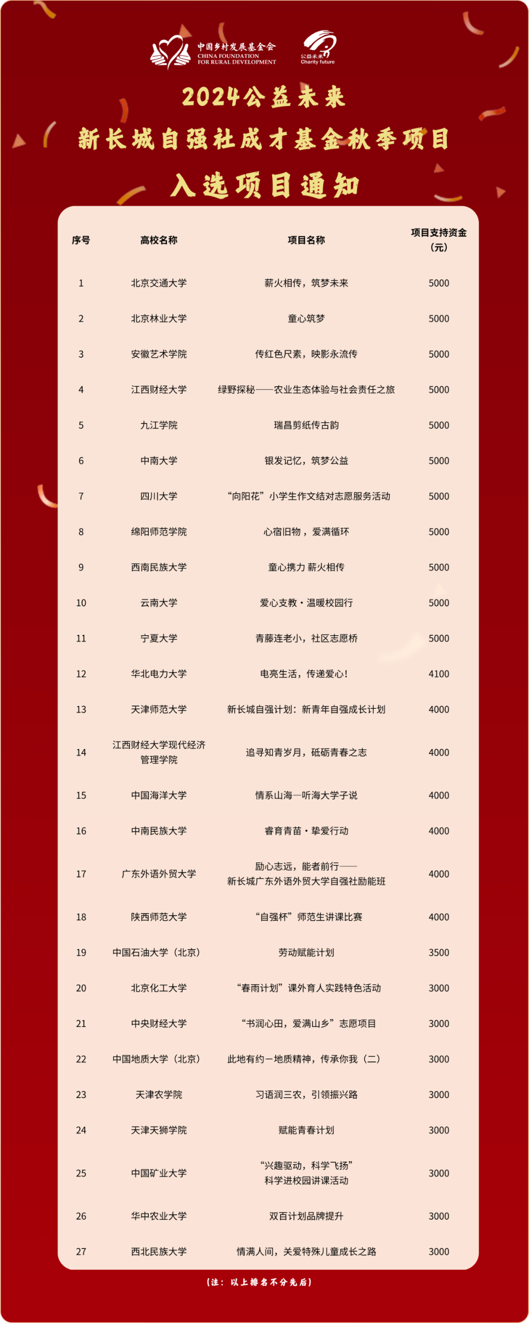 入选本季项目的共有27所高校,九江学院作为其中之一,将获得基金支持,用于推动自强社的公益实践活动。这将为永利yl23411集团官网学生提供更广阔的平台,让他们在实践中学习,在服务中成长,为社会贡献自己的力量。