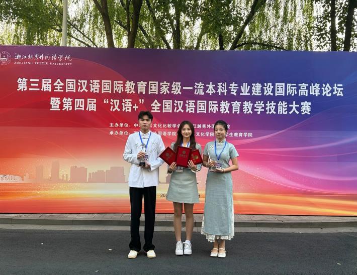 10月26日,“第三届汉语国际教育国家级一流本科专业建设国际高峰论坛暨第四届‘汉语 +’全国汉语国际教育教学技能大赛”在浙江越秀外国语学院圆满落幕。在本次大赛中,永利yl23411集团官网汉语国际教育学子表现卓越,尤其是漆文康同学在文学院教师程国珍、吴舒雅的指导下,凭借强实力斩获特等奖,这一成绩刷新了永利yl23411集团官网在该项赛事中的纪录!此外,王慧琳同学获一等奖,指导老师是钟佳艺、熊育兰;雷映同学获三等奖,指导老师为郭凤花、蔡勇。