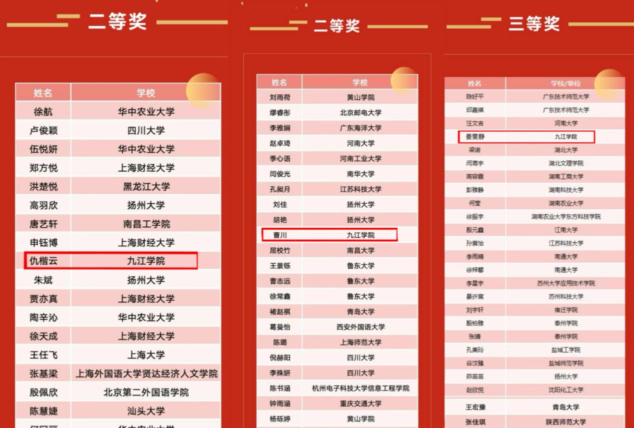 在全国赛中,仇楷云(外国语学院)获高级组二等奖;曹川(文学院)获初级组二等奖;姜雯静(外国语学院)获初级组三等奖。在江西省赛中,仇楷云再获高级组一等奖,张洋洋获高级组三等奖,杨钰洁获中级组三等奖;曹川、姜雯静、刁铖程、李研硕、陈佳柔、韩静怡等分获初级组一、二、三等奖。
