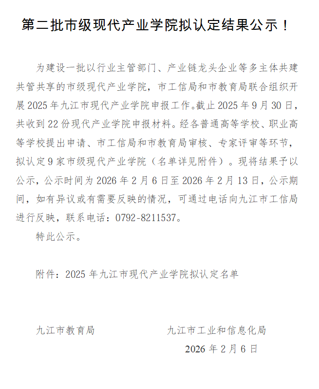 近日,九江市工信局、九江市教育局联合公示2025年九江市第二批市级现代产业学院拟认定结果,永利yl23411集团官网申报的九江学院(庐山)生物与医药产业学院、九江学院碳中和(节能环保)产业学院、九江学院工业文旅与遗产保护产业学院等3家产业学院成功入选。