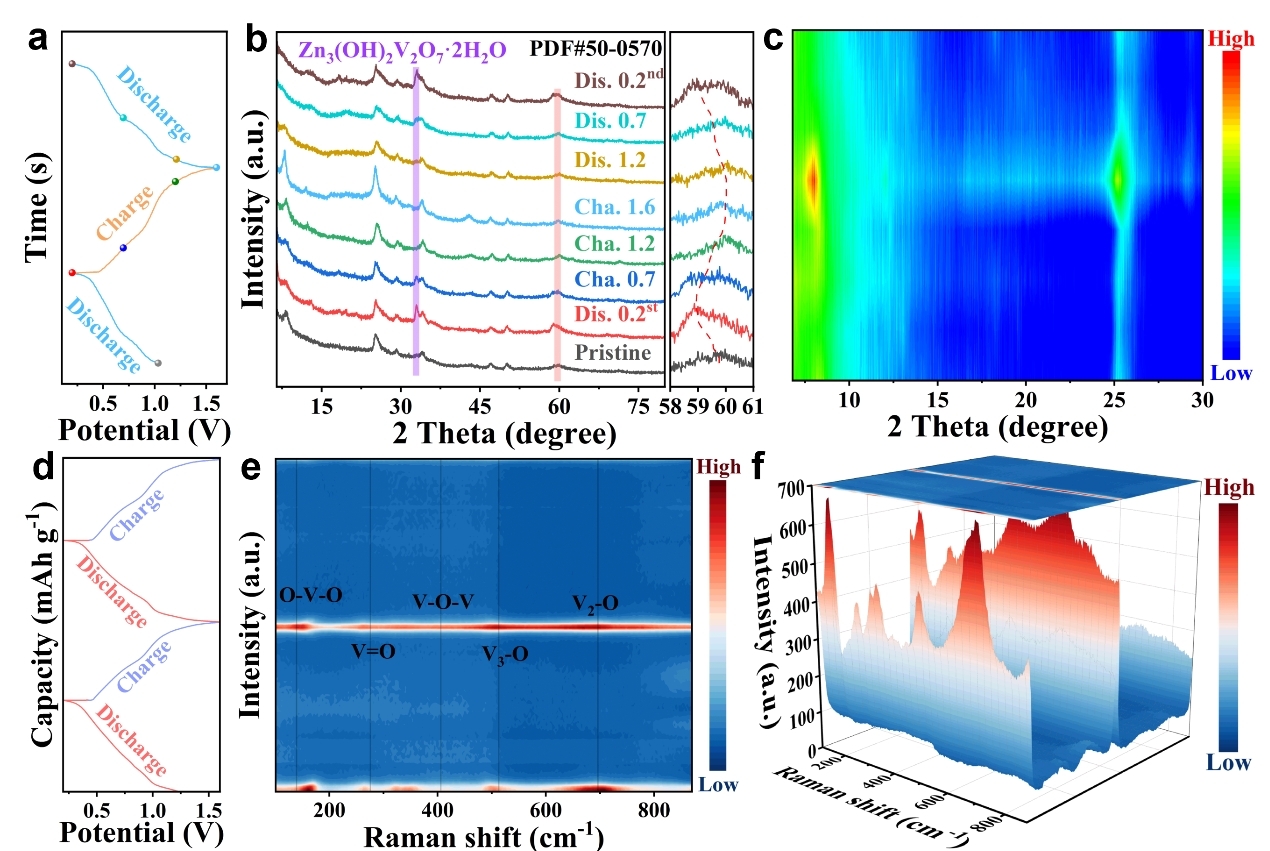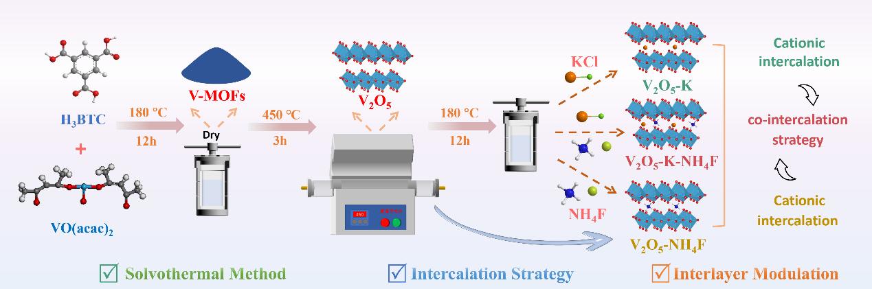 针对这一行业痛点,永利yl23411集团官网科研团队创新提出金属有机框架(MOFs)衍生和双离子协同插层的改性策略。通过水热合成与高温煅烧工艺,以钒基金属有机框架为前驱体制备层状V2O5,再通过二次水热过程将K⁺和NH4⁺双离子协同插入其晶格中,成功制备出V2O5-K-NH4F复合正极材料。该策略通过双离子的协同作用,实现了三重优化效果:一是将V2O5的层间距从4.37 Å大幅拓展至10.69 Å,为锌离子迁移提供畅通通道;二是K⁺与NH4⁺形成 协同支柱效应,有效抑制钒溶解和结构坍塌;三是通过氢键作用和电子结构调控,提升材料导电性和反应动力学。