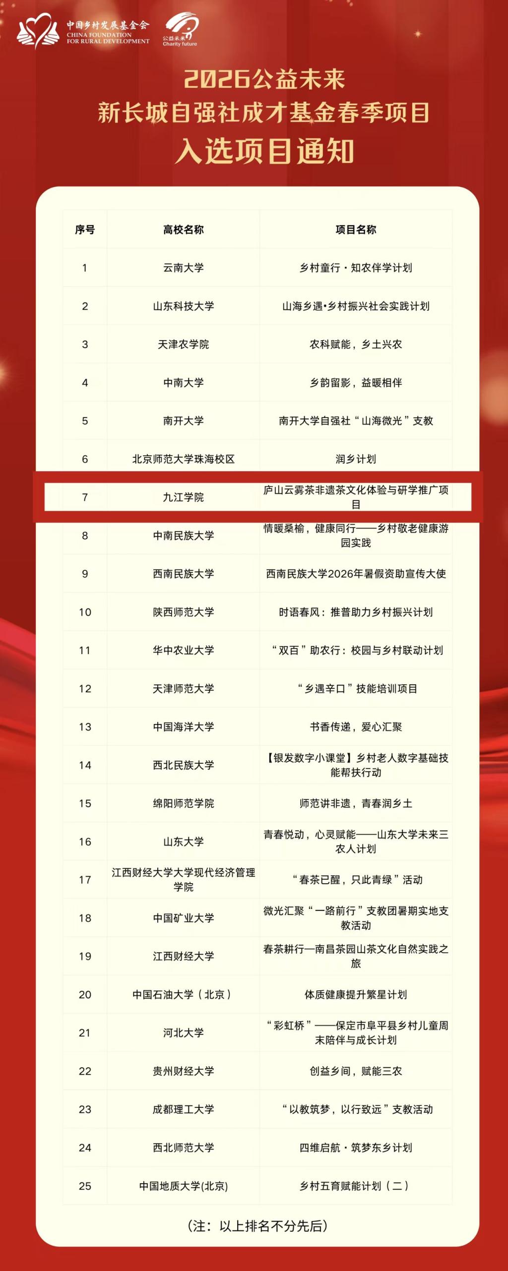喜报|九江学院成功入选2026公益未来·新长城自强社成才基金春季项目